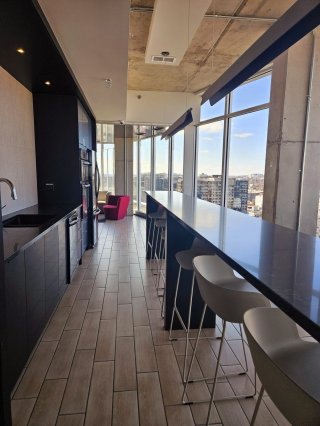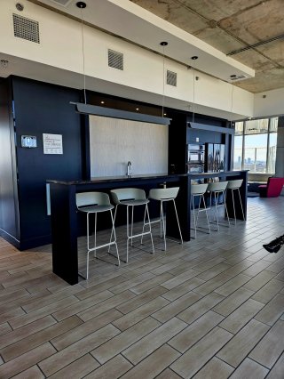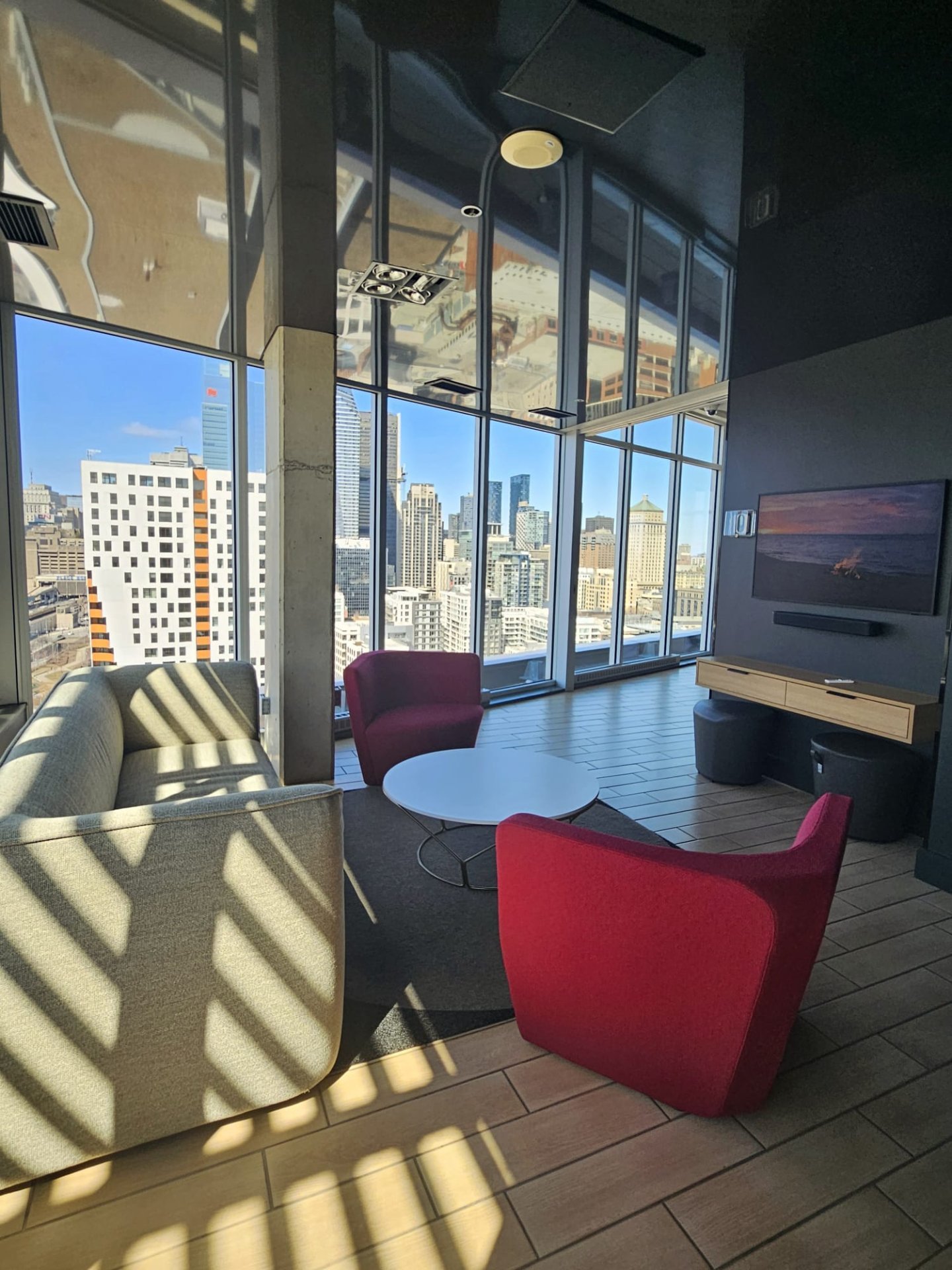 * Lounge vitré avec écran géant, foyer, cuisine et coin